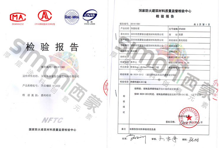 西蒙STUCCO灰泥(飾面砂漿)按照GB862402012標(biāo)準(zhǔn)判定,該制品燃燒性能達(dá)到不燃A(A1)級